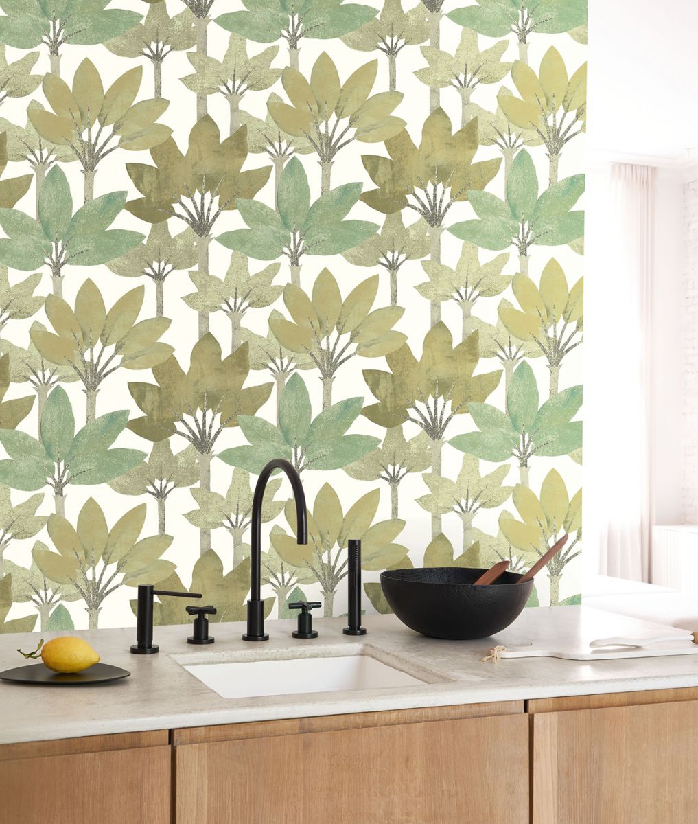 Het voordeel van behangpapier in de keuken of badkamer is dat je voor één opvallende accentmuur kan kiezen, om een specifiek deel van de ruimte te benadrukken. Gebruik het behang bijvoorbeeld als alternatief voor tegels.