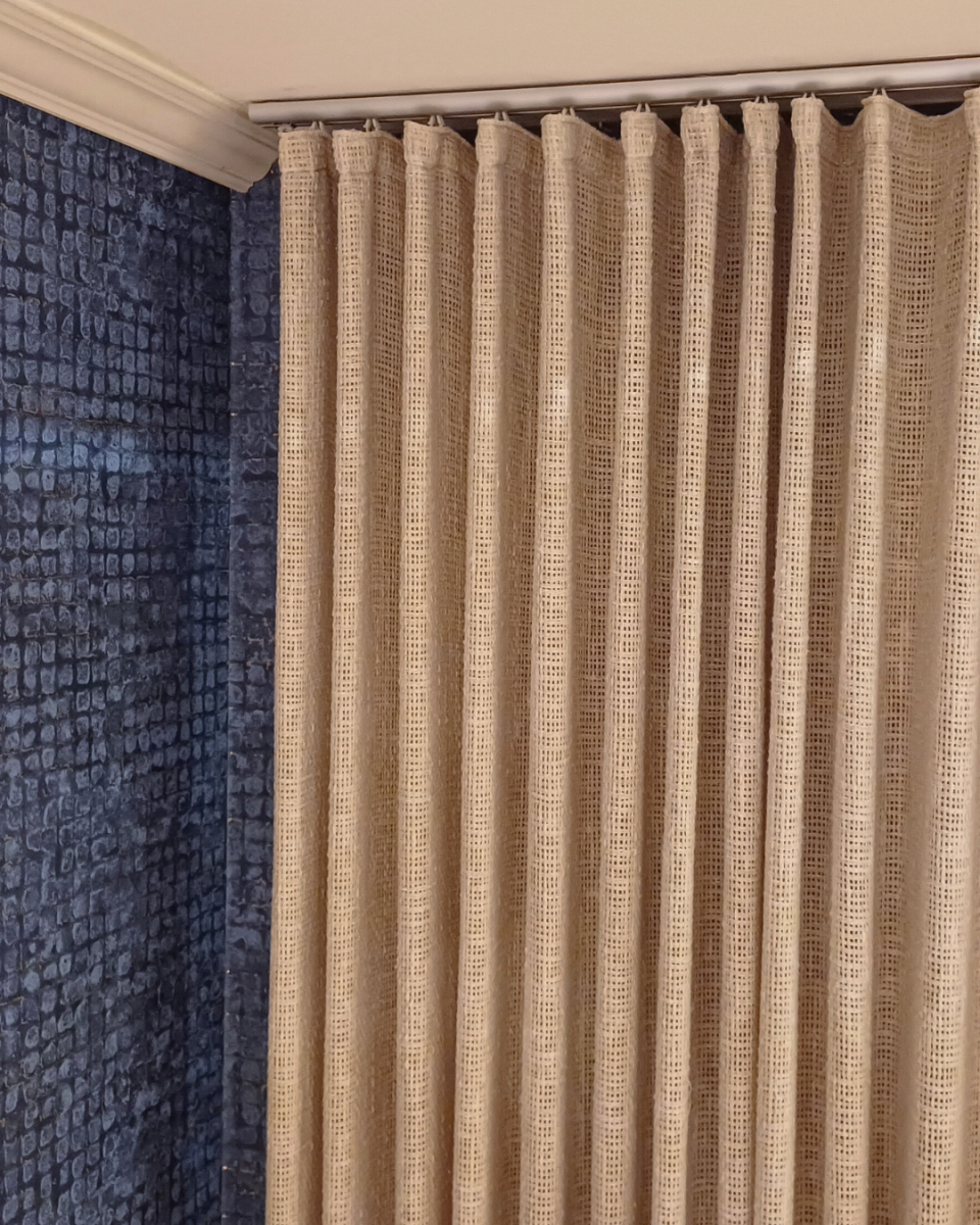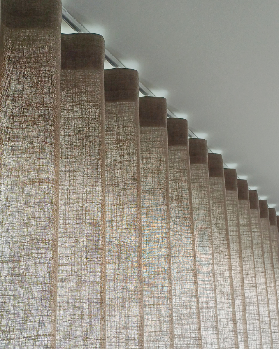 Waveplooi: Golvende beweging door speciaal railsysteem, strakke uitstraling, plooien vallen mooi gelijk. Minder stof nodig dan bij andere gordijnplooien.