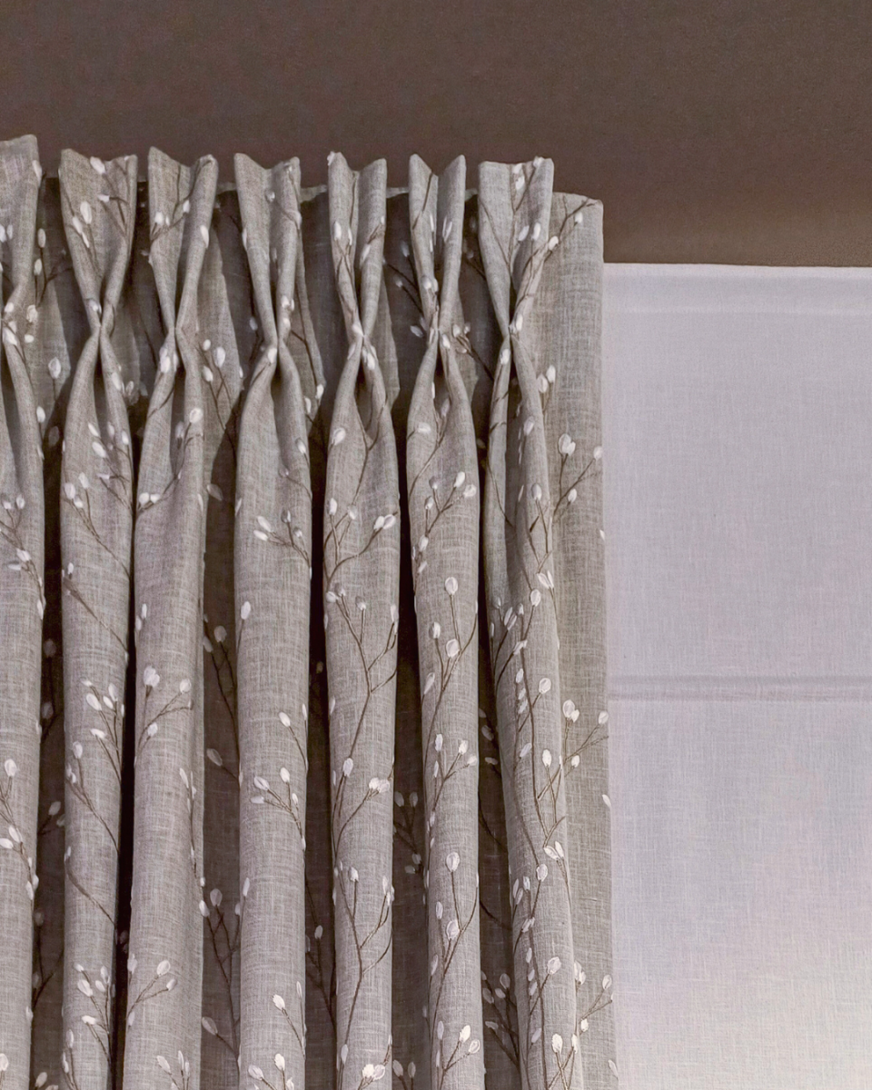 Standaard plooi: Valt naturel. Stof kan wijder uitlopen aan de onderkant, afhankelijk van de gekozen stof.