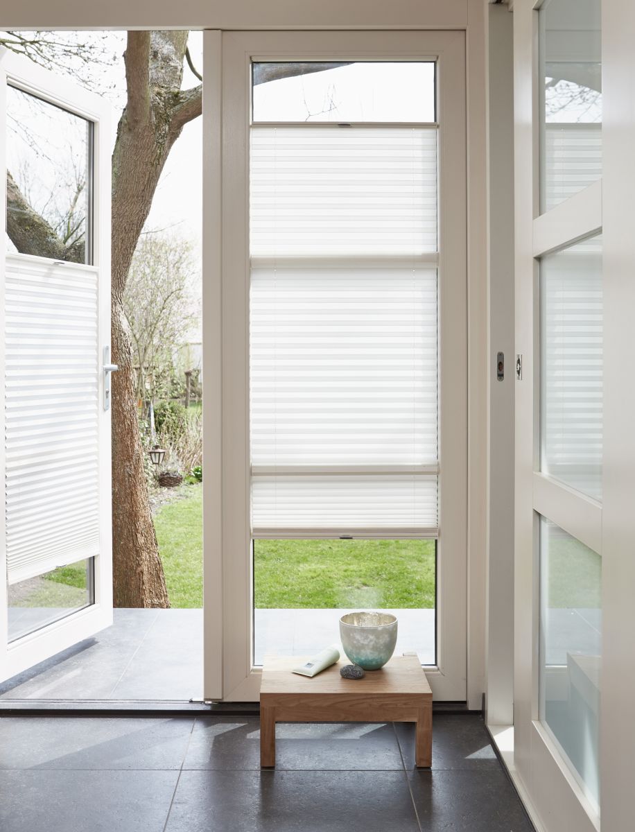 Inkijk beperken: Jaloezieën, in-between gordijnen, vouwgordijnen, (duo) plisségordijnen.